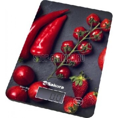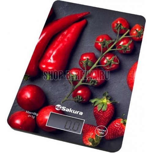 Электронные, нагрузка 8 кг, цена деления 1 г, ЖК дисплей, учет веса тары, автомат.отключение, индикатор перегрузки и заряда батарейки, питание 1*CR2032 , пластиковый корпус, рабочая поверхность из прочного стекла, рисунок: перцы.