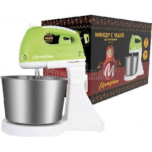 МАТРЁНА MA-015 Подходит для смешивания и взбивания 7 скоростных режимов Венчики для взбивания Металлическая чаша объемом 2 л Прорезиненные ножки Мощность 150 Вт