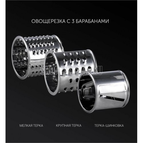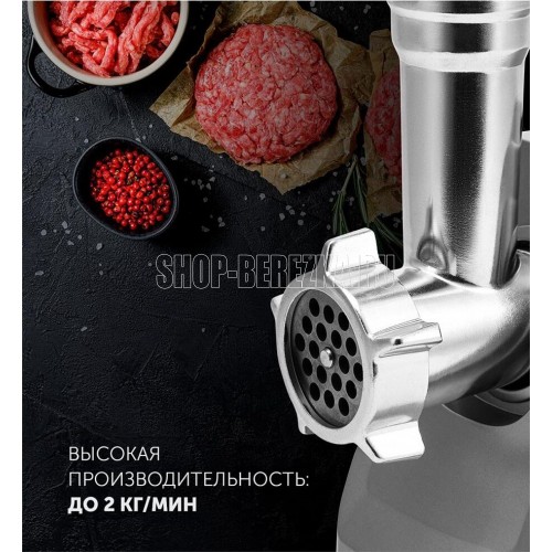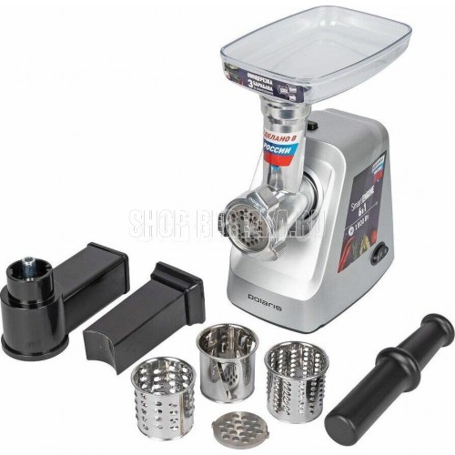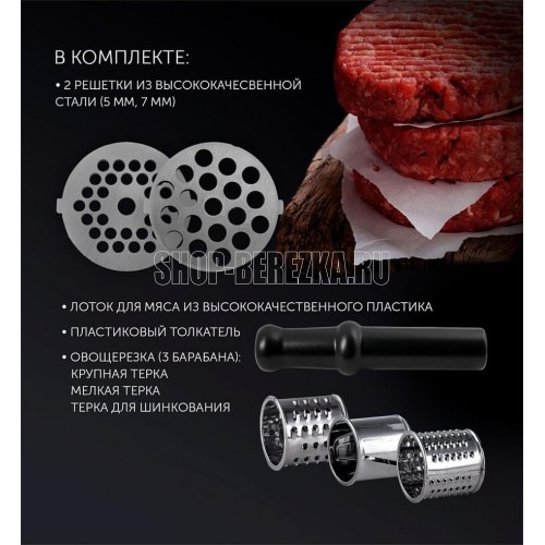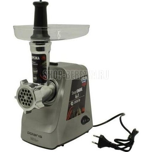 Мощность 1800 Вт.Производительность, кг/мин 2.Овощерезка.Материал корпуса Нержавеющая сталь пластик.Нескользящие ножки.В комплекте: 2 решетки из высококачесвенной стали (5 мм, 7 мм).Лоток для мяса из высококачественного пластика.Пластиковый толкатель.Овощерезка (3 барабана). Крупная терка.Мелкая терка.Терка для шинкования.
