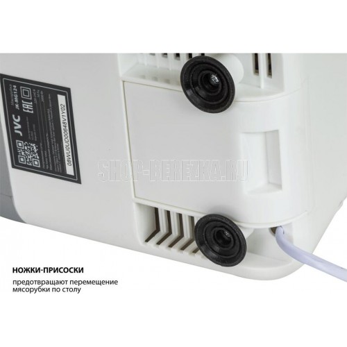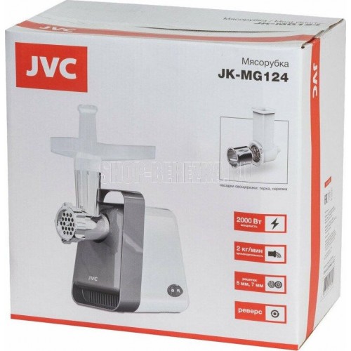 JVC JK-MG124 Мощность, Вт. 2000 Производительность, кг/мин. 2 Функция "Реверс" есть Механический фиксатор блока мясорубки есть Материал ножа нержавеющая сталь Материал лотка пластик Особенности Ручка для перемещения есть Отсек для хранения решеток есть Защита двигателя от перегрузки есть Прорезиненные ножки есть Комплектация Решетки 5 мм, 7 мм Насадки терка, нарезка Полная комплектация мясорубка, насадки-овощерезки, гарантийный талон, инструкция на русском языке Корпус Материал корпуса пластик Цвет белый с серым Энергопотребление
