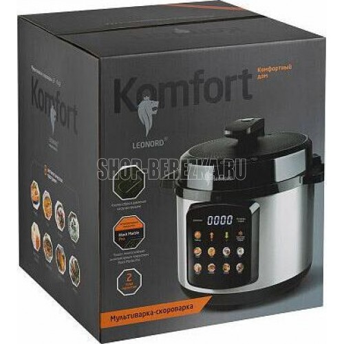 Обьем чаши 5 л Чаша с многослойным антипригарным покрытием Black Marble Pro Сенсорное управление LCD дисплей 8 автоматических программ приготовления: рыба, детское меню, суп, тушение, каша, курица, рис, мясо Поддержание температуры Таймер отсрочки запуска до 24 часов Kнопка сброса давления на крышке Мощность: 1000 Вт В комплекте: мерный стакан, ложка, книга рецептов Гарантия 2 года Универсальный прибор для приготовления пищи. Современная технология приготовления блюд под давлением позволяет максимально сохранить натуральный вкус и полезные свойства продуктов. Важной особенностью мультиварки-скороварки LEONORD является сокращение времени приготовления блюд более чем в два раза по сравнению с классическими способами приготовления.