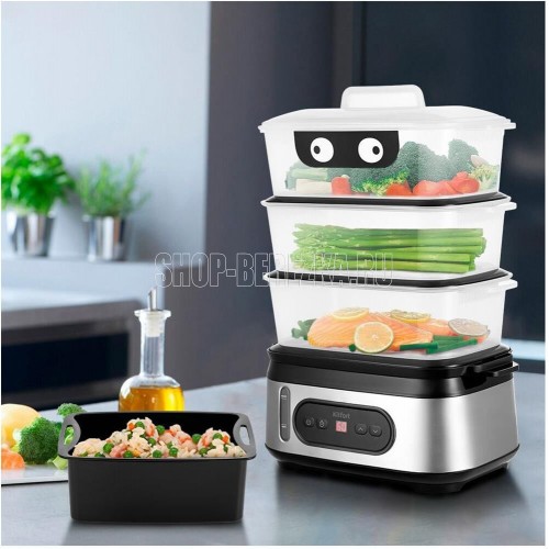 Мощность 800-950 Вт Таймер приготовления до 90 мин с шагом 1 мин Время отложенного старта до 12 ч с шагом 1 ч Ёмкость резервуара для воды 1,5 л Ёмкость корзины 3 л Внутренний размер корзины 232 х 140 х 92 мм Ёмкость чаши для риса 1,5 л Размер чаши для риса 210 х 134 х 80 мм Ёмкость поддона 0,3 л Длина шнура 0,7 м Размер устройства 330 х 214 х 452 мм