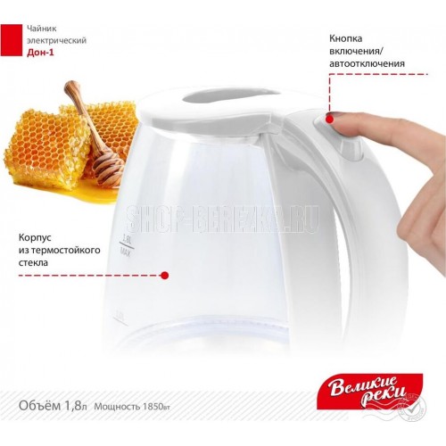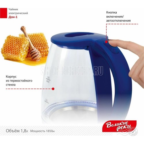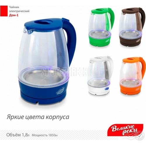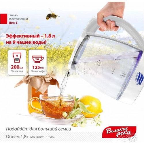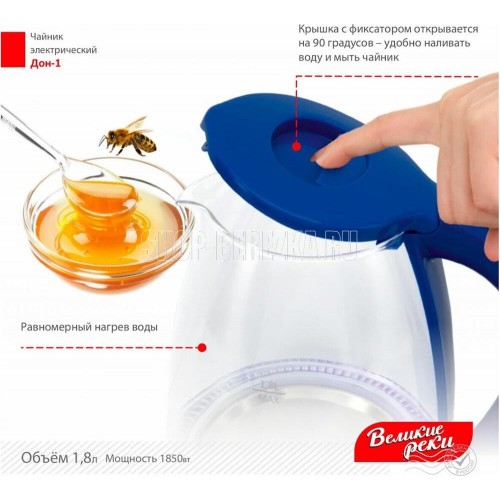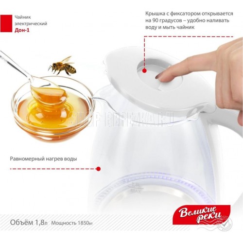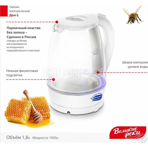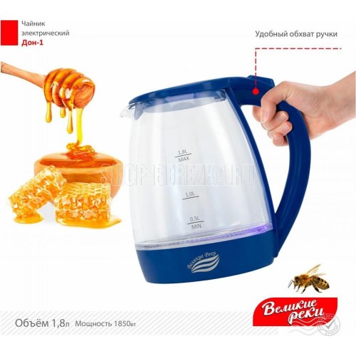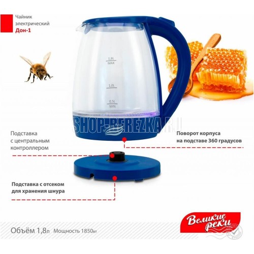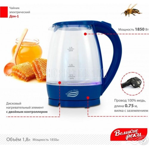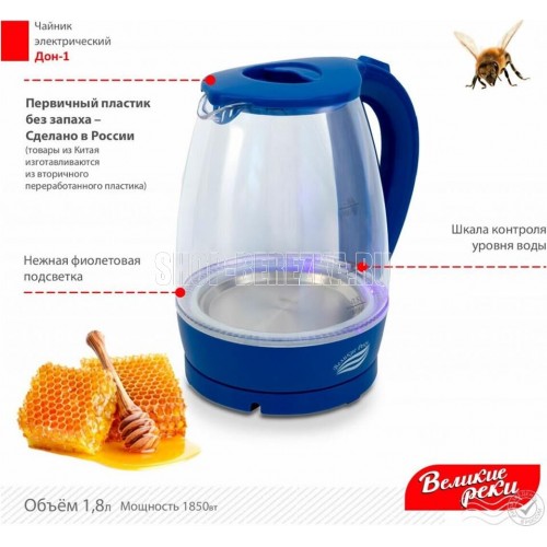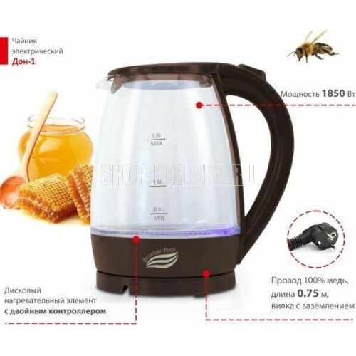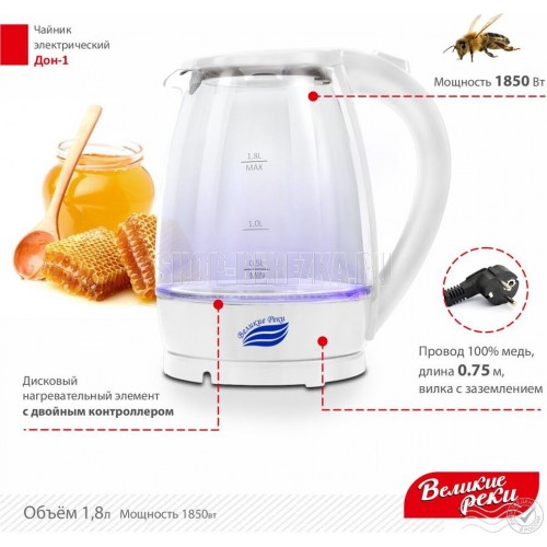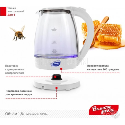 LED (Light Emitted Diode) индикатор с синей подсветкой.Корпус из термостойкого стекла и первичного пластика.Автоматический и ручной выключатель.Поворот на подставке 360°.Отсек для хранения шнура.Дисковый нагревательный элемент из высококачественной нержавеющей стали.Объём 1,8 л.Мощность 1850 Вт Рабочее напряжение 220 В.Частота сети питания 50 Гц.Класс защиты: I. Размер прибора: 220х160х245 мм.Размер прибора в упаковке: 230х160х230 мм