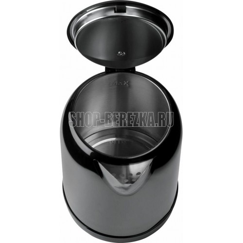 Корпус из нержавеющей стали. Объем 1,8л. Подставка с поворотом на 360°. Блокировка включения без воды. Автоматическое отключение при закипании. Отделение для хранения шнура. Шкала уровня воды внутри чайника. Легкое открытие крышки.
