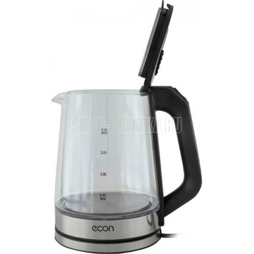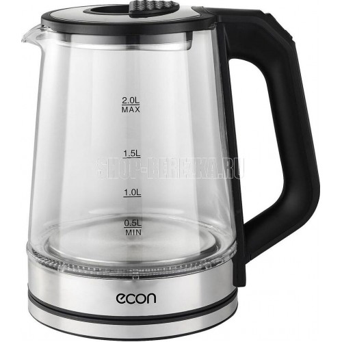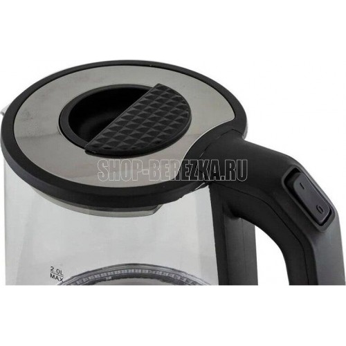 Чайник стеклянный, дисковый нагревательный элемент, емкость 2 литра, мощность 1500 Вт, светодиодная подсветка, автоматическое отключение при закипании, защита от включения без воды