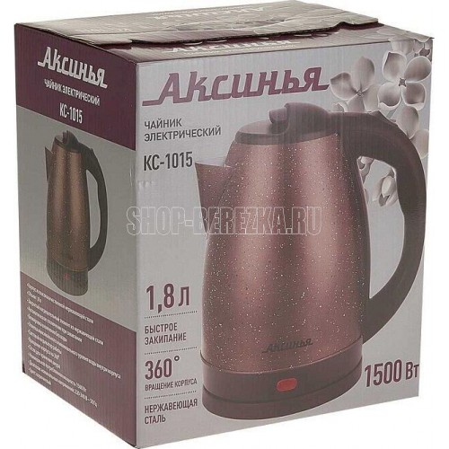 Параметры Объем 1,8 л Номинальная потребляемая мощность 1500 Вт Описание Чайник электрический предназначен для нагрева воды в бытовых и аналогичных условиях Корпус из высококачественной нержавеющей стали с цветным декоративным покрытием Цвет покрытия: коричневый Вращение корпуса на 360° Закрытый нагревательный элемент из нержавеющей стали Световой индикатор работы Отметка максимального и минимального уровня воды внутри корпуса Отсек для хранения шнура питания Быстрое закипание Автоматическое отключение при закипании Блокировка включения без воды Упаковка: цветная коробка