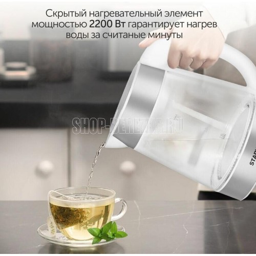 Мощность 2200 Вт; Максимальный объем 1.7 л; Нагревательный элемент скрытый; Индикатор включения; Индикатор уровня воды; Фильтр от накипи; Автоматическое отключение; Защита от включения без воды