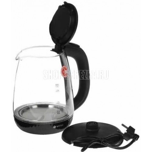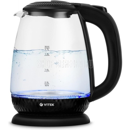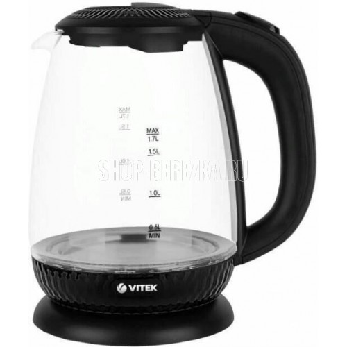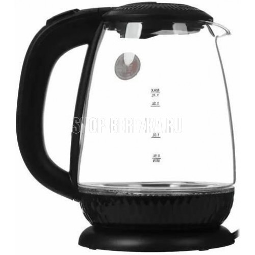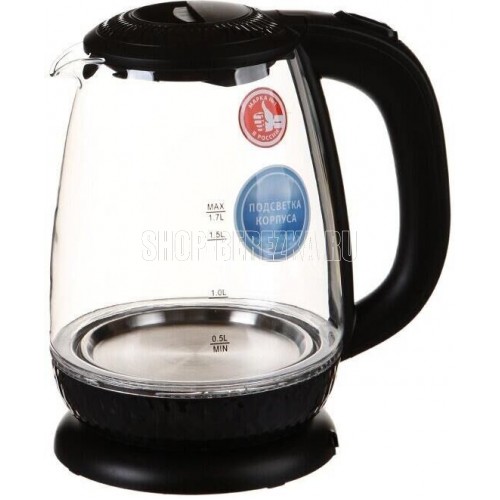 Чайник электрический. Мощность: 2200 Вт, Объем: 1,7 литра, Материал корпуса: экологичное термостойкое стекло, Способ открывания крышки: механическое, Подсветка, Фильтр, Индикатор уровня воды, Индикация включения, Отключение при отсутствии воды, Отсек для хранения шнура, Покрытие нагревательного элемента: нержавеющая сталь, Тип нагревательного элемента: скрытый, Цвет: Черный.