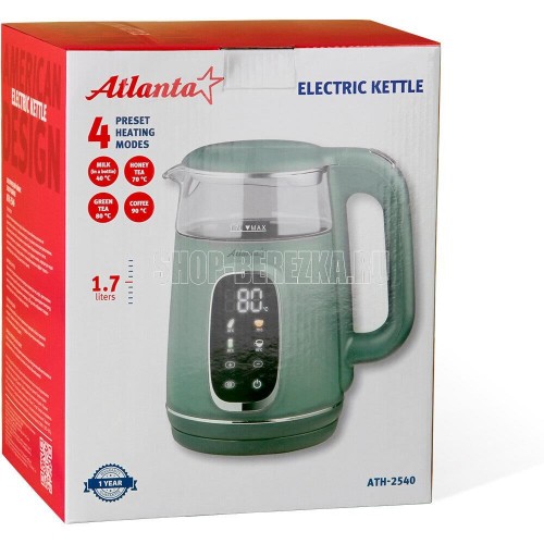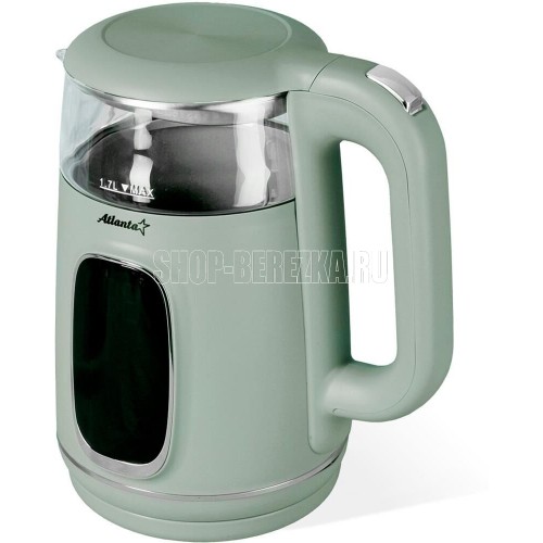 Чайник Atlanta ATH-2540 - это двухстенный электрочайник, выполненный в стильном зеленом цвете. Объем чайника составляет 1,7 литра, что позволяет приготовить достаточное количество напитка для большой компании. Особенностью этого чайника является композитный двухслойный корпус. Внутренняя колба выполнена из термостойкого боросиликатного стекла, что обеспечивает долговечность и безопасность использования.