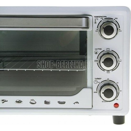 27л, духовка 1500Вт, механ.управление, 3 режима работы духовки (верх, низ, верх+низ), таймер на 60 минут, регулировка температуры духовки, комплектация - металлическая решетка, противень, круглая форма для выпечки (230x50мм), ухват. Цвет: белый.