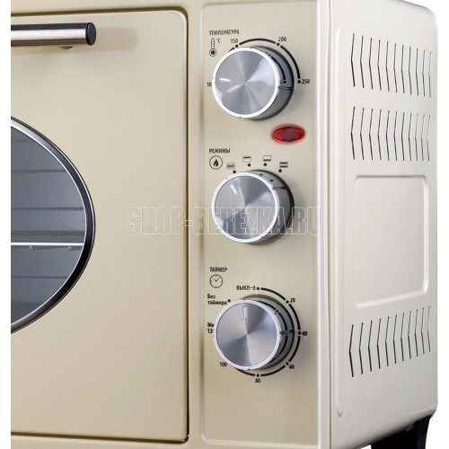 Объем 33 л; Мощность 1500 Вт; 220-240 В; Механический тип управления; Регулировка температуры до 250°С; Ручка из нержавеющей стали; Таймер; световой индикатор; Внутренняя подсветка; 3 режима работы; Плавная регулировка мощности; Цвет: бежевый/хром Комплектация: съемная ручка для поддона, съемная решетка, противень эмалированный прямоугольный
