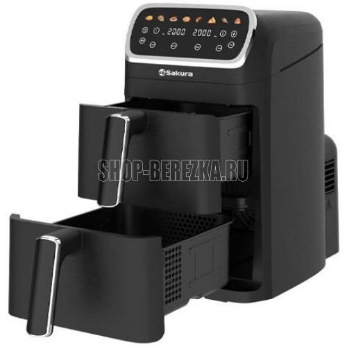 Аэрогриль; Мощность: 2600 Вт; Общий объем: 10л (2 чаши по 5 л); 8 программ приготовления; Возможность готовки каждой чаше по отдельности или в обеих сразу; Регулировка температуры: 80-200 °C; Таймер на 60 мин; Сенсорное управление; Готовит без масла или с минимальным его использованием; Подходит для всех блюд, которые готовятся в духовке; Цвет: черный; Длина шнура 80см; Размер: 352x222.5x404 мм