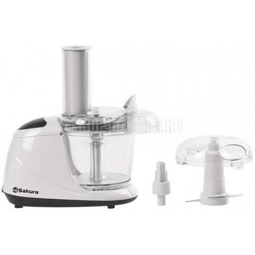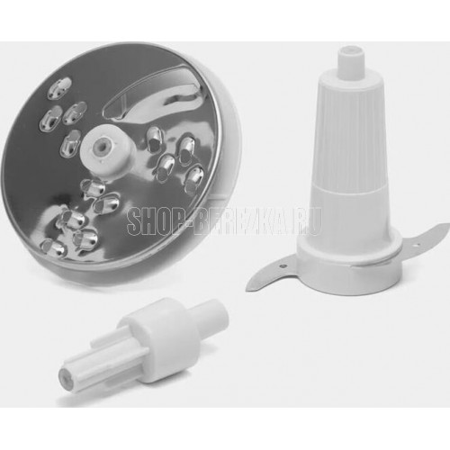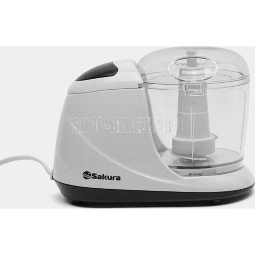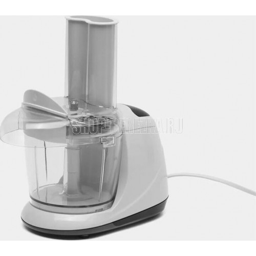 Чоппер с 2 доп. насадками. 400 Вт, 0,35 л, пластиковая чаша, 2 лезвия из нержавеющей стали, насадка для взбивания яиц и насадка для нарезки овощей, одна скорость, цвет белый.
