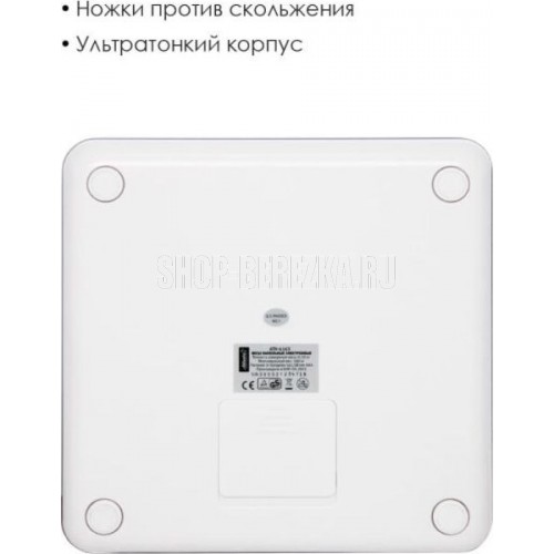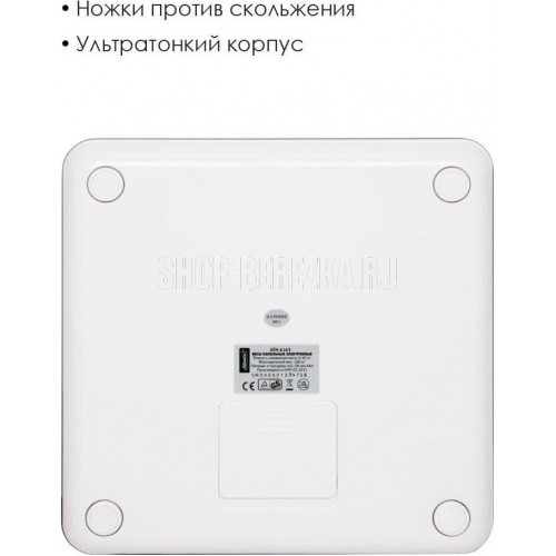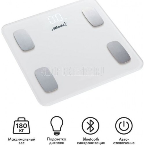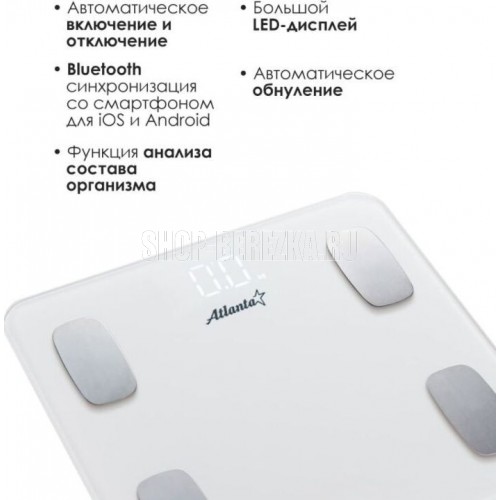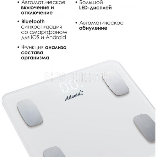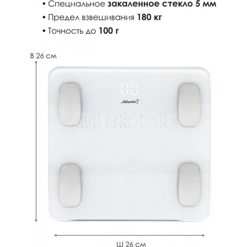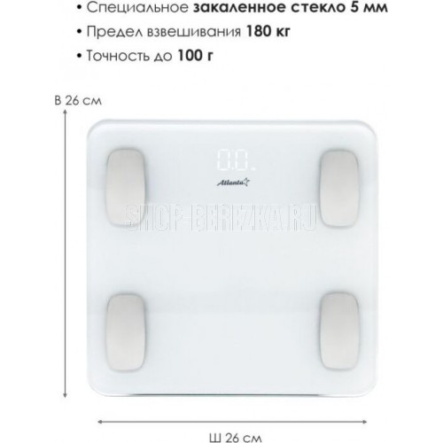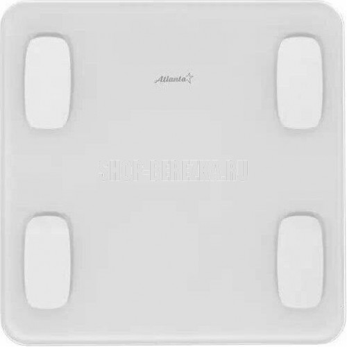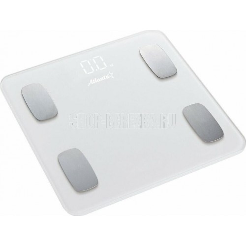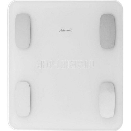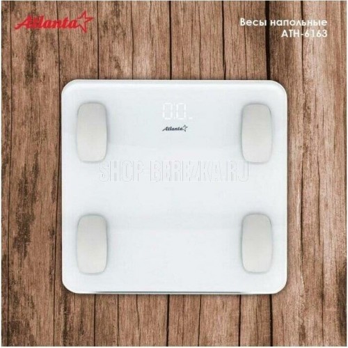 ATLANTA ATH-6163 (WHITE) Анализатор организма, 28 х 28 х 2 см, стекло 5 мм, до180 кг, точность 100 г. КОРПУС Специальные высокопрочные материалы и новая технология дают возможность увеличить предел взвешивания до 180 кг. ТОЧНОСТЬ Полностью электронный принцип взвешивания на системе из четырех сенсоров гарантирует высокую точность измерения Вашего веса. Благодаря отсутствию механических элементов, весы прослужат многие годы. СОВРЕМЕННЫЙ ДИЗАЙН Благодаря превосходному дизайну, выполненному с учетом самых современных тенденций, весы удачно впишутся в интерьер помещений. АНАЛИЗАТОР ТЕЛА Весы снабжены анализатором биоэлектрического сопротивления позволяющего получать полные сведения о составе тела: жировая масса, процентное соотношение воды, костной и мышечной тканей. Дополнительно предусмотрена возможность использовать прибор детям от 10 лет.