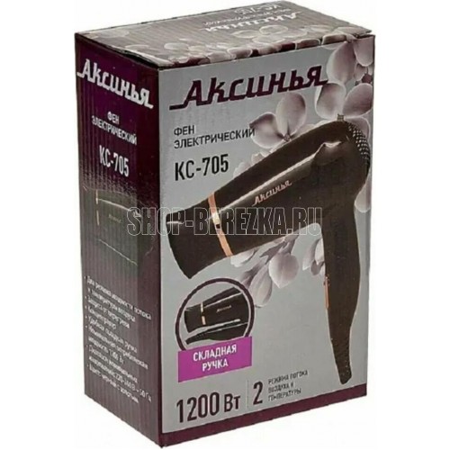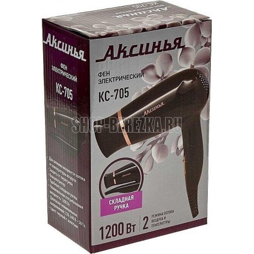 АКСИНЬЯ КС-705 черный с золотым Параметры Номинальная потребляемая мощность 1200 Вт Описание Фен электрический предназначен для сушки и укладки волос в бытовых и аналогичных условиях Цвет: черный с золотым Удобная складная ручка Съемная насадка-концентратор Два режима мощности потока и температуры воздуха Защита от перегрева Упаковка: цветная коробка
