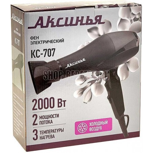 Параметры Номинальная потребляемая мощность 2000 Вт Описание Устройство предназначено для сушки и укладки волос в бытовых и аналогичных условиях Корпус из высококачественного термостойкого пластика Цвет: черный Съемная насадка-концентратор Петелька для подвешивания Два режима мощности потока воздуха Три режима температуры потока воздуха Функция «Холодный воздух» Защита от перегрева Упаковка: цветная коробка
