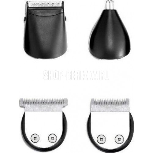 Мощность 3 Вт, Непрерывная работа 45 мин., Полная зарядка 8 ч., База с подзарядкой , Индикатор зарядки , Насадка для стрижки, Насадка-стайлер, Бритвенная насадка, Триммер для носа и ушей, Щеточка, Масло, 4 насадки(3,6,9,12 мм).