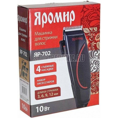 Номинальная потребляемая мощность 10 Вт, Электропитание от сети 220В - 50Гц, Лезвия из нержавеющей стали, Регулировка длины срезаемых волос, Четыре съёмных гребня: 3, 6, 9, 12 мм.