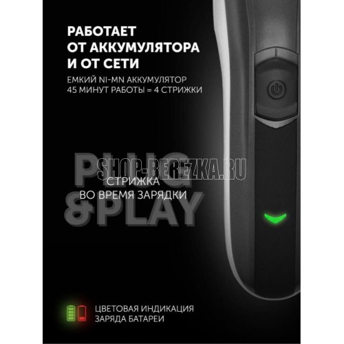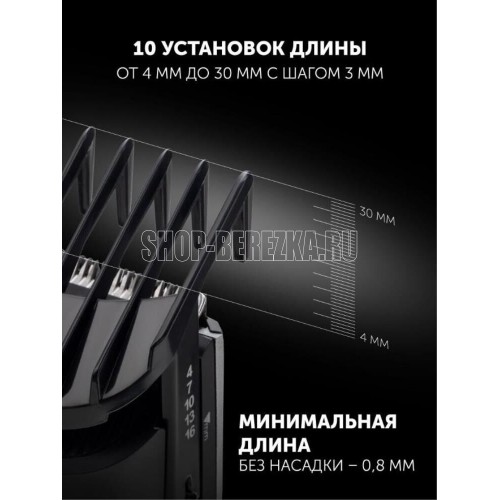 материал лезвий: нержавеющая сталь, минимальная длина стрижки: 0.8 мм, максимальная длина стрижки: 30 мм, число установок длины: 10, питание: автономное/от сети, время работы от аккумулятора: до 45 мин, маренго/серебро,Количество насадок 2.