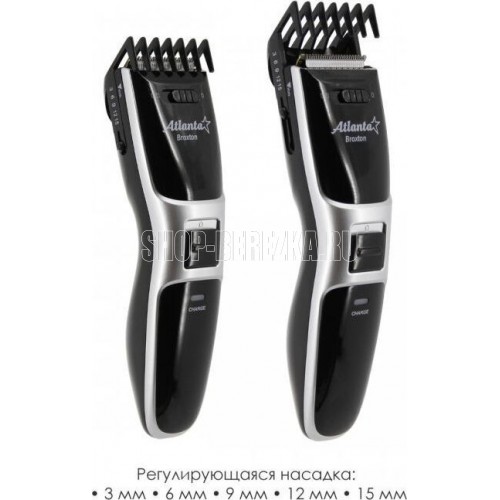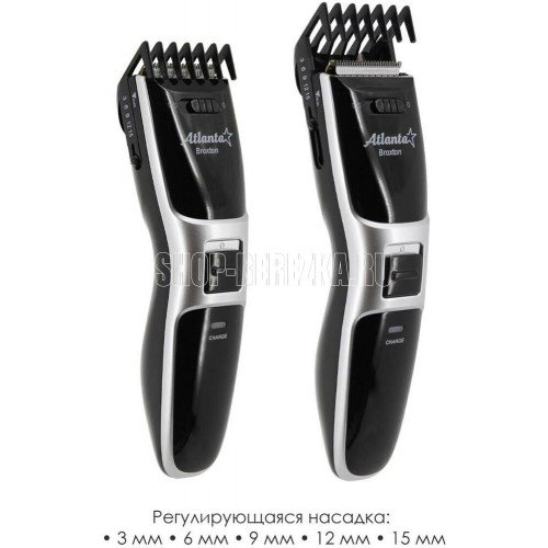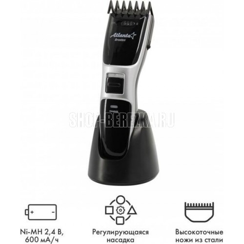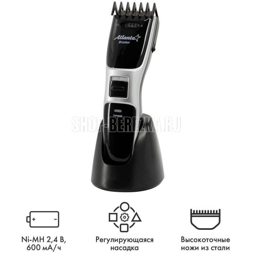 ATLANTA ATH-6902 (SILVER) Удобная подставка с зарядкой Питание от аккумулятора и через адаптер Регулируемая насадка: 3, 6, 9, 12,15 мм Функция филировки Дополнительные аксессуары в комплекте Индикатор зарядки Прецизионные ножи из стали высокой прочности Долговечный, мощный аккумулятор Ni-MH 2,4 В; 1200 мА/ч