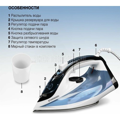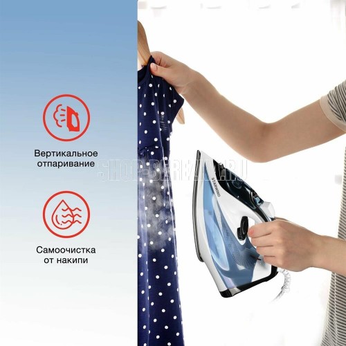 Мощность: 2400 Ватт Емкость для воды 350 мл Регулировка температуры Функция разбрызгивания Паровой удар Вертикальное отпаривание Функция самоочистки от накипи Противокапельная система Керамическое покрытие подошвы Длина сетевого шнура 2 м