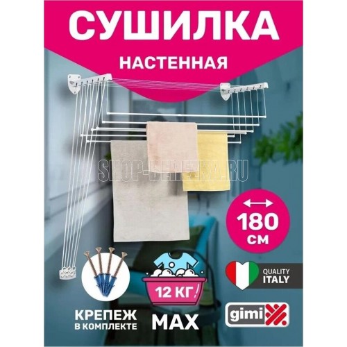 (ВхДхШ)135х180х46см.Материал: сталь, пластмасса, текстиль.Длина стержня: 1,8 м.Максимальный вес (белья): 12 кг.Длина кронштейна: 43 см.Цвет белый.