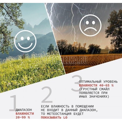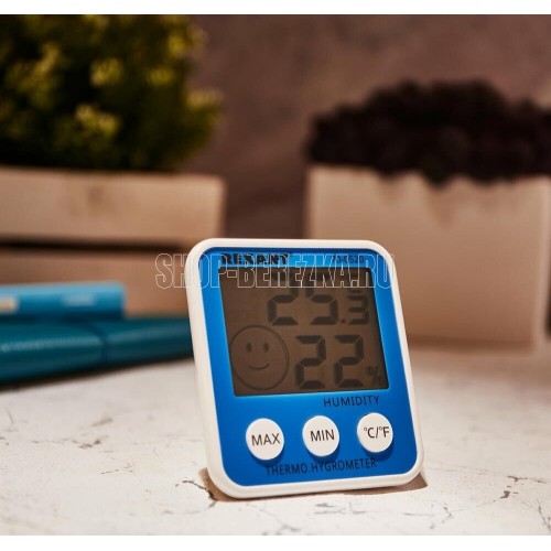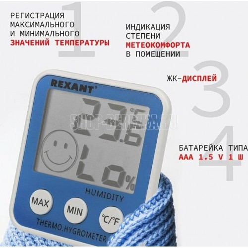 Отображение температуры и относительной влажности в помещении, переключение единиц отображения,температуры °С /°F, сохранение в памяти МАКС./МИН, значений температуры в помещении , отображение комфортного уровня, появление значка при температуре в помещ
