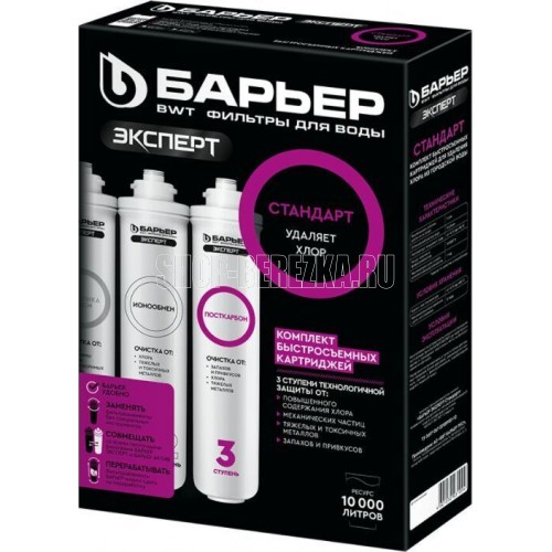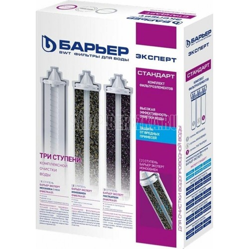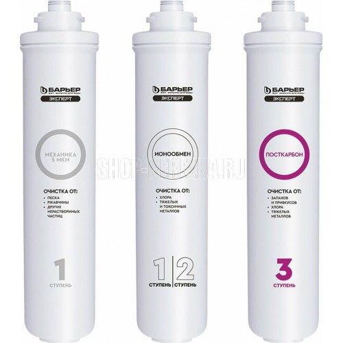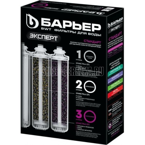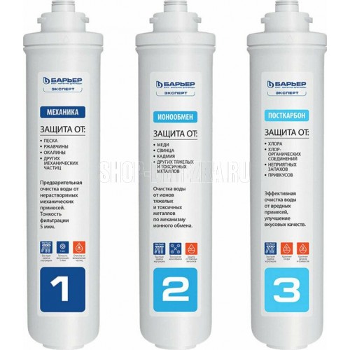 Комплект компактных сменных картриджей для фильтров. Применяется в трехступенчатых системах водоочистки «Эксперт Стандарт» для комплексной очистки водопроводной воды от основных содержащихся в ней вредных примесей. Подходит ко всем фильтрам линейки БАРЬЕР Эксперт.