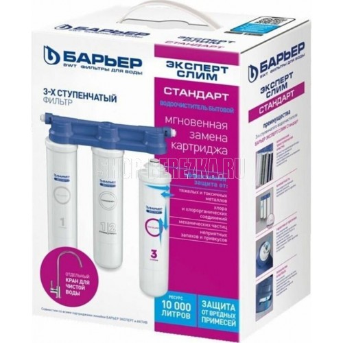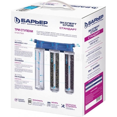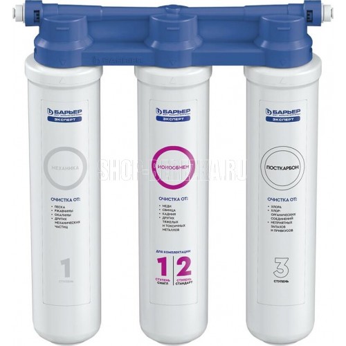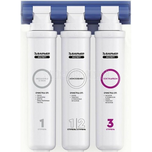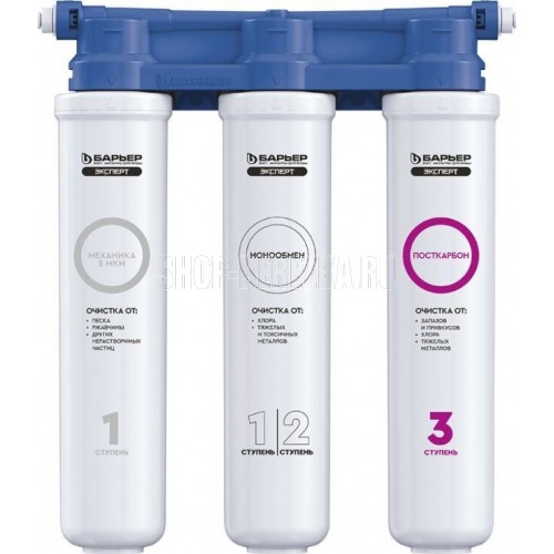 Изменённая версия нашей популярной модели БАРЬЕР ЭКСПЕРТ, Комплексная очистка водопроводной воды от всех основных содержащихся в ней вредных примесей. Картриджи всё так же можно менять одной рукой, теперь положение фильтрующих элементов статично. Вода проходит три этапа очистки: 1. "БАРЬЕР ЭКСПЕРТ Механика" удаляет любые механические примеси до 5 мкм (песок, пластик, ржавчину и т.д.). 2. "БАРЬЕР ЭКСПЕРТ ИоноОбмен" используется для эффективного удаления хлора, его соединений, а также тяжелых металлов (свинец, медь, кадмий и другие). 3. "БАРЬЕР ЭКСПЕРТ ПостКарбон" - финишная очистка и кондиционирование, устранение неприятных привкусов и остаточного хлора. Преимущества: - Технология SmartLock предотвращает протечки и срыв картриджа под давлением. - Технология OneTouch позволяет быстро поменять картридж без специальных знаний, инструментов или ключей. Система протестирована по стандарту NSF (США) на максимальное давление 30 АТМ. 4-х кратный запас прочности.