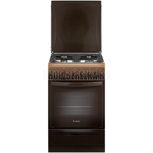 Габариты: 50х58.5х85 см. Полезный объем духовки: 52 л. 4 газ. конфорки. Таймер электронный. Газ-контроль горелок стола и духовки. Электророзжиг горелок стола и духовки. Вертел, Гриль, подсветка.; Цвет коричневый