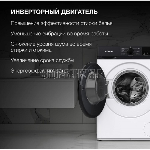 Стиральная машина, полноразмерная 50-60см, тип загрузки – фронтальная, максимальная загрузка – 8 кг, электронное управление, инверторный мотор, скорость отжима - 1200 об/мин, 12 программ, уровень шума при стирке - 56 дБ, защите от детей, отсрочка старта, максимальное время отсрочки – 24 часа, обработка паром, дозагрузка белья, класс энергопотребления – A, цвет – белый
