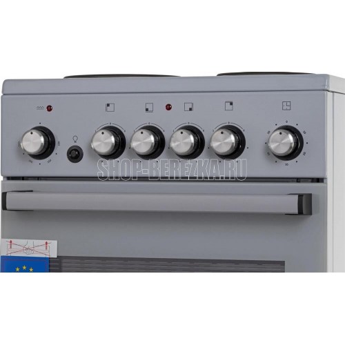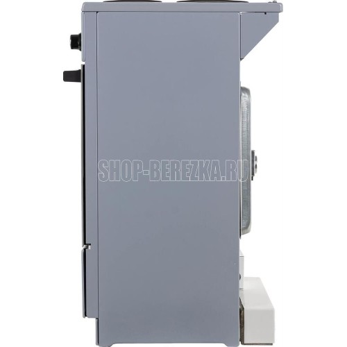 Размеры, мм - высота/ширина/глубина – 850/500/500 * Цвет - серый * 4 электрические конфорки 1,0/1,5/1,5/2,0 кВт * Объём духовки 43 л. * Гриль * Вертел * Освещение * Таймер механический * Большой противень * Малый противень * Решётка для жарки * Хозяйственный отсек *