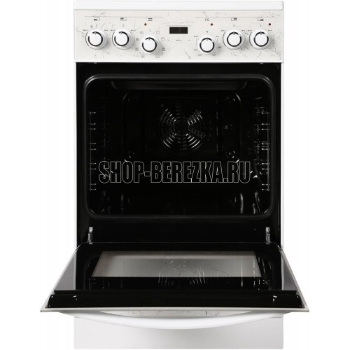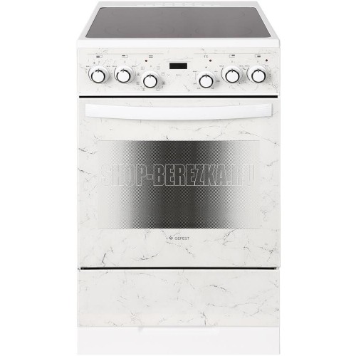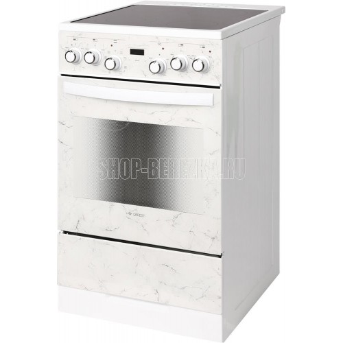 Габариты, ШхГхВ, см: 50x58.5x85; Цвет: белый, с рисунком "мрамор"; Дизайн: мрамор; Ширина, см: 50; Фасад: закаленное стекло; Варочная поверхность: стеклокерамическая; Количество зон приготовления: 4; Класс энергоэффективности: А; Диапазон номинальных напряжений, В: 220-230; Номинальная потребляемая мощность электроэнергии, кВт: 6,72-7,35; Объем духовки, л: 55; Конвекция; Мощность верхнего ТЭН духовки, кВт: 0,8; Мощность нижнего ТЭН духовки, кВт: 1,2; Мощность ТЭН вентилятора, кВт: 2,0; ТЭН-гриль: 1,2; Внутреннее покрытие духового шкафа: эмаль легкой очистки SMART CERAMIC; Управление: сенсорное , механическое; Таймер: сенсорный, многофункциональный; Двухзонные комфорки; Гриль: электрический; Вертел с электроприводом; Шашлычница; Ускоренный нагрев с конвекцией; Подсветка духовки: двойная; Направляющие духовки: съемные проволочные; Терморегулятор; Ящик для посуды и принадлежностей: выдвижной ящик; Ножки регулировочные; Сетевой шнур и вилка: в наличии