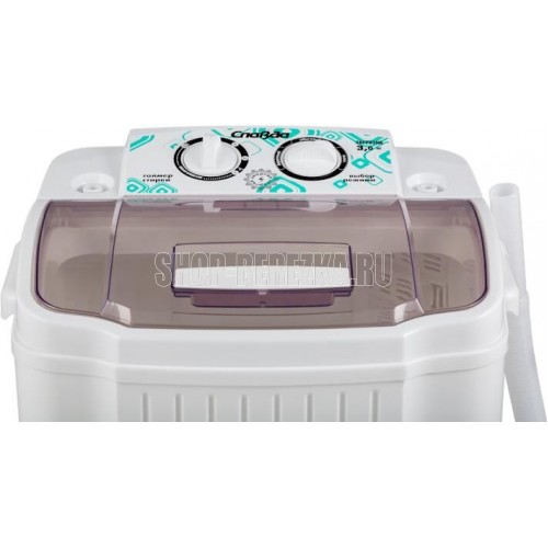 (ШхГхВ)41х33х63,5см.Цвет белый с полупрозрачными окошками.Загрузка сухого белья в бак стирки, до (кг): 3.Максимальная потребляемая мощность (Вт): 200.Тип активаторный.Загрузка вертикальная.Тип активаторный.Загрузка вертикальная. Реверс, снижающий эффект закручивания белья.Двигатель повышенной мощности. Материал корпуса полипропилен.Фильтр для сбора ворса и пуха .