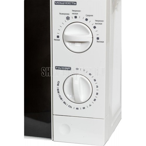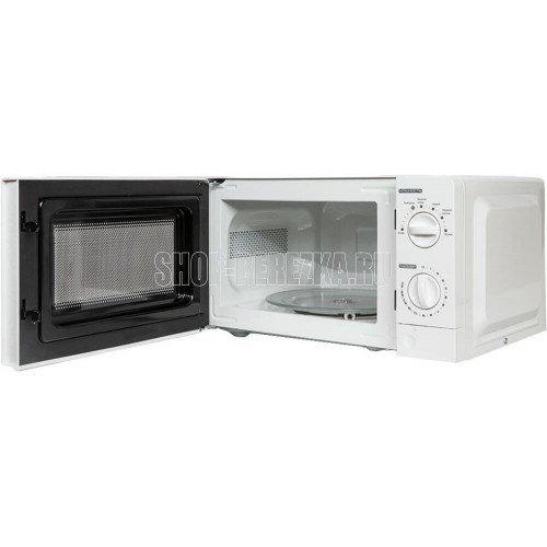 Печь микроволновая, объем 20л, выходная мощность 700 Вт, тип управления механический, 6 уровней мощности, разморозка, таймер на 30 минут, диаметр поворотного стола 245 мм, сигнал окончания приготовления.
