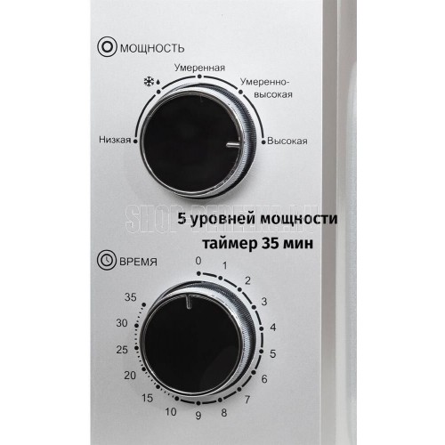 Печь микроволновая, объем 20л, выходная мощность 700 Вт, тип управления: механический, диаметр поворотного стола: 255 мм, количество уровней мощности: 5, автоматическое размораживание, таймер: 35 минут, тип открывания дверцы: ручка, сигнал окончания приготовления, цвет: серебро