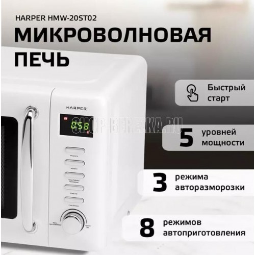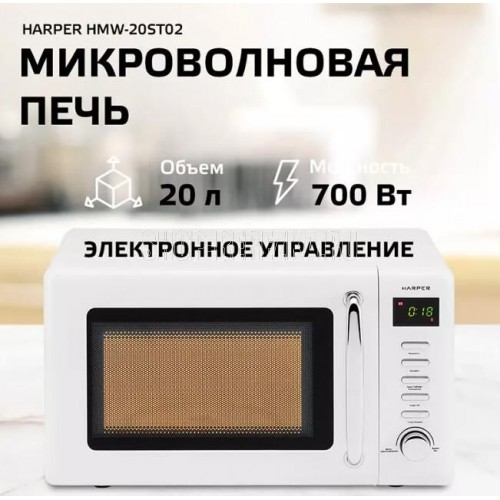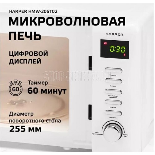 Объем: 20 л. Потребляемая мощность: 1150 Вт. Мощность микроволн: 700 Вт. Количество уровней мощности: 5. Тип управления: электронный. Дверца: навесная. Тип открывания дверцы: ручка. Цифровой дисплей: да. Цвет дисплея: зеленый. Часы: да. Подсветка камеры: да. Диаметр поддона: 255 мм. Быстрый старт: да. Таймер: 60 мин. Звуковой сигнал завершения работы: да. Режим разморозки: да. Количество режимов авторазморозки: 3. Блокировка от детей: да. Внутреннее покрытие камеры: эмаль. Режим последовательного приготовления: да. Количество рецептов автоприготовления: 8. Длина сетевого шнура: 0.85 м. Цвет: черный, белый. Размеры (ШхВхГ): 451х258х354 мм. Вес: 10.2 кг. Гарантия: 1 год. Срок службы: 3 года.