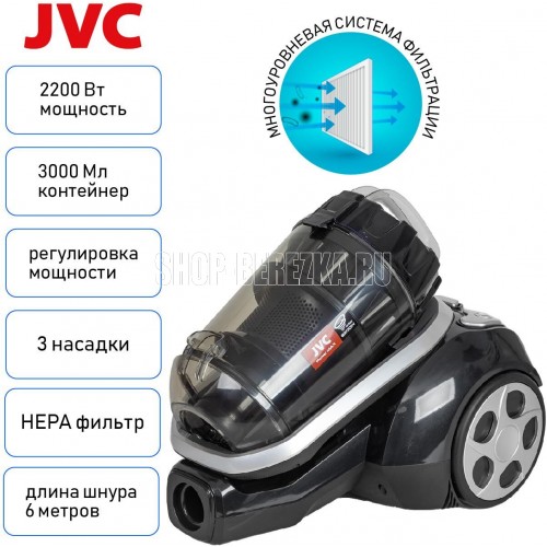 JVC JH-VC411 Тип пылесоса циклонный Система "Мультициклон" да Емкость пылесборника, л. 3 Материал пылесборника пластик Мощность всасывания, Вт. 400 Регулировка мощности есть Управление воздушным потоком на ручке да Тип трубки телескопическая Материал трубки металл Система фильтрации многоуровневая система фильтрации, моющийся НЕРА фильтр Уровень шума, дБ. 79 Смотка шнура автоматическая Функции Сухая уборка есть Комплектация Насадки щетка пол/ковер, щелевая насадка 2 в 1, насадка для мебели Полная комплектация пылесос, телескопическая трубка, гибкий шланг, щетка пол/ковер, щелевая насадка 2 в 1, насадка для мягкой мебели, держатель для аксессуаров, гарантийный талон, инструкция на русском языке Корпус Материал корпуса пластик Цвет черный Габариты и вес Длина сетевого шнура, м. 6 Энергопотребление Максимальная потребляемая мощность, Вт. 2200 Электропитание, В., Гц. 220-240, 50
