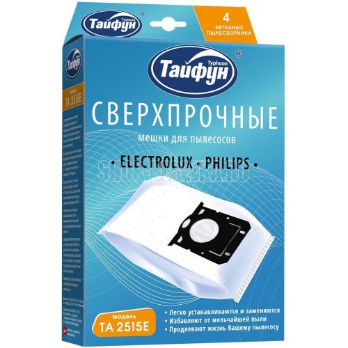 ТАЙФУН ТА 2515 Е Сверхпрочные нетканые пылесборники с антибактериальной обработкой учитывают все требования производителей пылесосов, соответствует высоким стандартам качества и обеспечивает наивысший уровень фильтрации. Сочетание нескольких слоев нетканого материала в пылесборниках удерживает микрочастицы пыли размером до 0,3 микрон, что соответствует фильтрации НЕРА-фильтра. Воздух, проходя через нетканый мешок-пылесборник, очищается от бактерий, пыльцы растений, спор плесени, пылевых клещей и других примесей, вызывающих аллергию. Рекомендуется использовать нетканые пылесборники, если в доме есть маленькие дети.