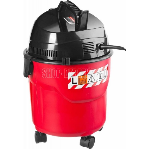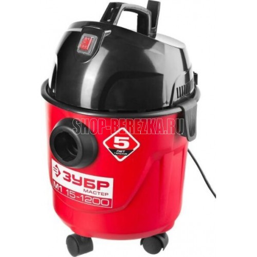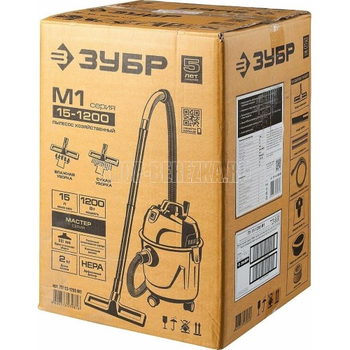 Тип - хозяйственный для влажной и сухой уборки. Мощность - 1200 Вт. Рабочее разрежение (не менее) - 16 кПа. Объем бака - 15л. Розетка для электроинструмента - нет. Класс пыли - L. Фильтр- HEPA. Функция выдувания - нет. Влажная уборка- есть. Длина всасывающего шланга - 2м. Диаметр всасывающего шланга - 30мм. Диаметры патрубка-переходника - 22-41мм. Длина кабеля - 4м. Напряжение питания, В/Гц 220±10% /50. Габариты - 33x33x48 см. Масса изделия - 5.0 кг. Масса в упаковке - 6.3 кг.