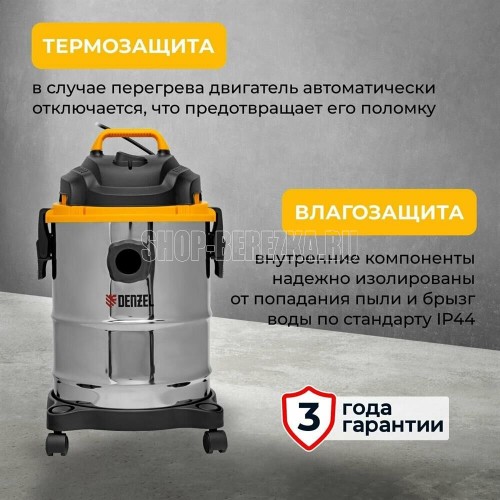 Мощность, Вт 1200 Бренд DENZEL Гарантия 3 года Длина кабеля, м 5 Длина шланга, м 2 Максимальное разрежение, кПа 18 Номинальное напряжение, В 230. Объем бака, л 15 Особенности Возможность сбора жидкости; Функция выдува; Термозащита; Мешки и фильтры в комплекте Расход воздуха, л/мин 1800 Степень защиты IPX4.
