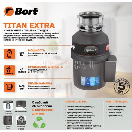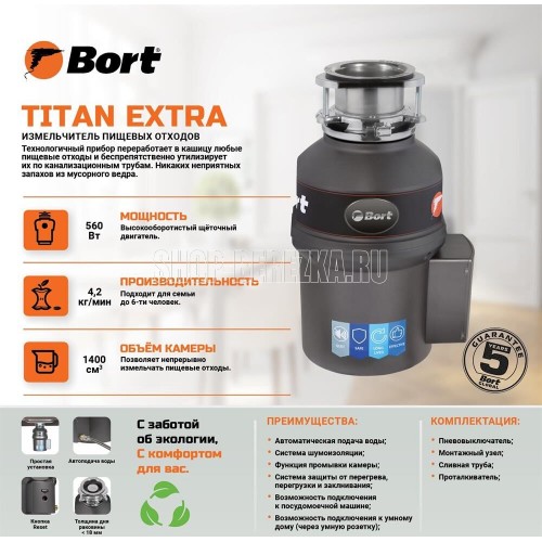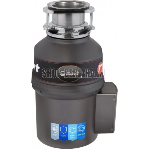 Автоматическая подача воды; Число ступеней измельчения 3 ; Функция авто-реверса; Мощность 560 Вт; Объем камеры 1450 мл; Материал корпуса камеры Прочный композитный материал; Материал измельчающих частей камеры Нержавеющая сталь; ; Система защиты от перегрузки и заклинивания; Вес изделия 6,8 кг; Напряжение сети 220 В; Частота тока 50 Гц; постоянный магнит; Мощность л.с. 0,75 ; Производительность 4,2 кг/мин; Уровень шума 58 дБ; Управление пневматическое.Возможность подключения к посудомоечной машине.; Гарантия 5 лет.