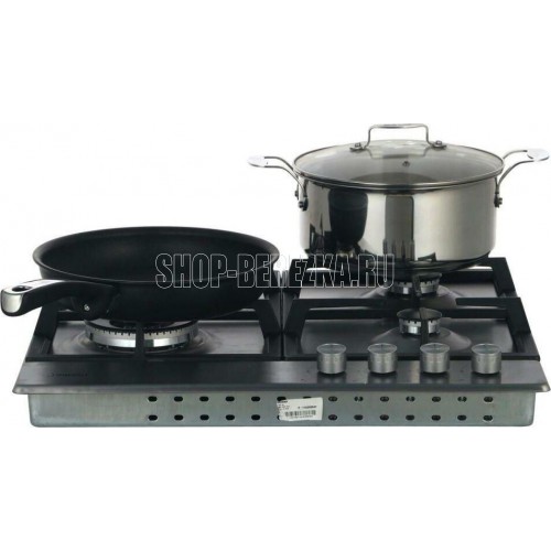 Газ на металле; 4 высокоэффективные конфорки; 60см; одна зона с двойным уровнем пламени; автоподжиг; газ-контроль; чугунные решетки; Расположение панели управления фронтальное; Цвет: Нержавеющая сталь