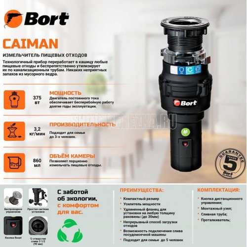 Назначение бытовой; Число ступеней измельчения 3 ; Система шумоизоляции Нет; Мощность 375 Вт; Объем камеры 860 мл; Материал корпуса камеры Прочный композитный материал; Материал измельчающих частей камеры Нержавеющая сталь; Система защиты от перегрузки и заклинивания; Скорость холостого хода 3000 об/мин; Вес изделия 4 кг; Напряжение сети 220 В; Частота тока 50 Гц; постоянный магнит; Мощность л.с. 0,5 ; Производительность 3,2 кг/мин; Диаметр сливного отверстия 3 1/2" (90мм); Толщина дна раковины 1...30 мм; Уровень шума 52 дБ; Длина шнура питания 1 м; Размер 360x145 мм; непрерывный; ; ; пневматическое; Вес брутто=4,3 (Вес нетто=4) кг; 17 x 17 x 41; Монтажный узел, Сливная труба, Проталкиватель; Простая система установки позволяет установить измельчитель самостоятельно в считанные минуты., Система защиты от перегрева, перегрузки и заклинивания защитит измельчитель от поломки.; гарантия 2 г