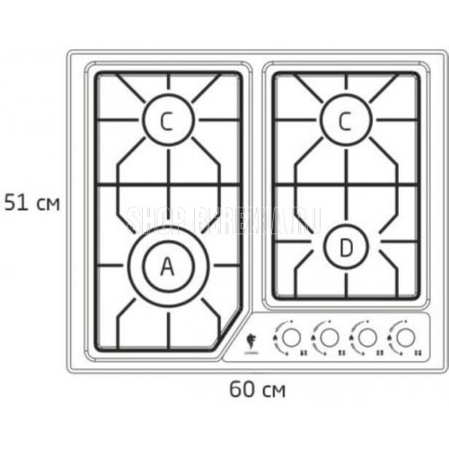 4 горелки Мощность горелок: 3,3(двойное пламя)/1,75/1,75/1,0 кВт Материал панели сталь Материал решетки чугун Размер 60*51 см Газ-контроль Электроподжиг Мощность электроподжига 1,5 Вт Фиксированное положение "Минимальное пламя" Набор форсунок для баллонного газа Тип газа: природный (метан), сжиженный (пропан-бутан) Давление газа G20 2000 Па (20 мбар) Вес 9,7 кг Длина шнура: 0,8 м Напряжение 220-240В,50-60Гц Гарантия 2 года