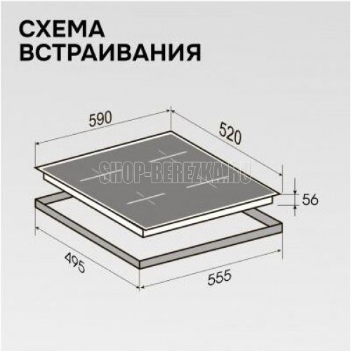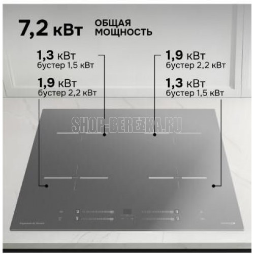 Стеклокерамическая варочная панель (индукция). 4 конфорки. Управление мультислайдер. Общая мощность: 7200 Вт. Бустер на каждую зону нагрева. Инвертор. Индикация остаточного тепла. Блокировка клавиатуры. Защита от перегрева. Автоотключение при длительном использовании. Автоматическое определение размера посуды и регулировка мощности. Таймер на каждую зону. Габариты (ШхГхВ): 590*520*56 мм. Ниша для встраивания (ШхГхВ): 555*495 мм. Длина шнура питания 885 мм. Цвет: Графит