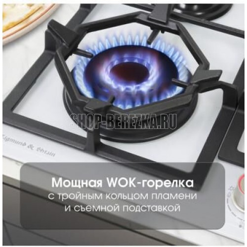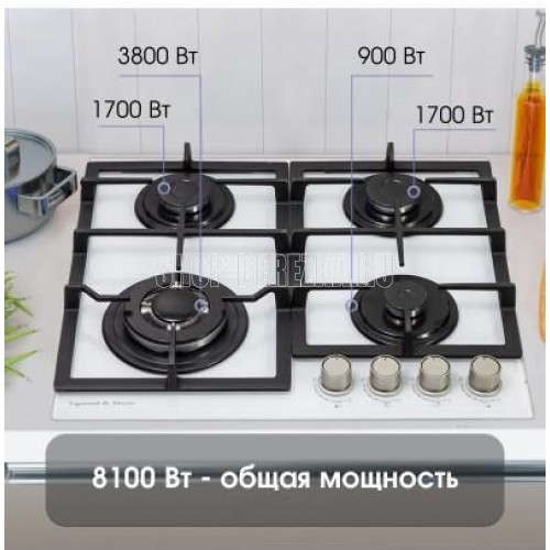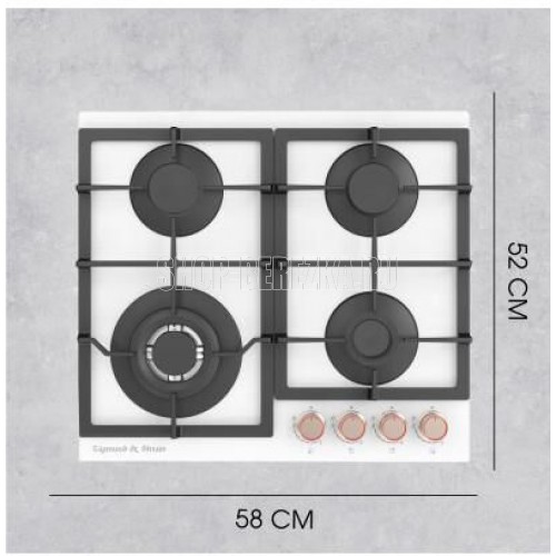 Газовая варочная панель. 4 конфорки. Управление фронтальное. Переключатели поворотные. Материал поверхности: закаленное стекло. Материал решеток/крышек горелок: чугун. Общая мощность: 8100 Вт. Газ-контроль. Электроподжиг на каждой ручке. WOK-конфорка. Адаптер для вока. Адаптер для кофе. Переходники для разных типов газа: для газа G30/30mbar в комплекте. Габариты (ШхГхВ): 580*520*52 мм. Длина шнура питания - 900 мм. Цвет: Белый.