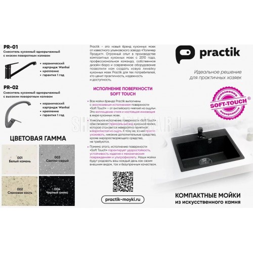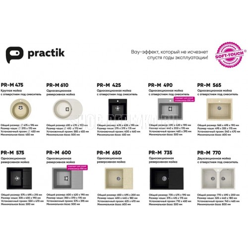 Классическая односекционная реверсивная мойка Practik PR-M 650 с плоским крылом является оборачиваемой - крыло может располагаться как справа,так и слева. Материал мойки представляет из себя искусственный камень, который является композитом на основе натурального мрамора и связующих смол. Искусственный камень существенно снижает уровень шума при падении струи воды. Специальное покрытие гелькоут защищает поверхность мойки от загрязнений и бытовых царапин, делая уход за мойкой легким и простым. Данная мойка устанавливается в шкаф от 60 см и дает возможность осуществить монтаж мойки в стандартную столешницу шириной 60 см. Заводская гарантия составляет 1 год, а срок службы данной мойки, при соблюдении основных правил ухода за ней, составляет более 10 лет.