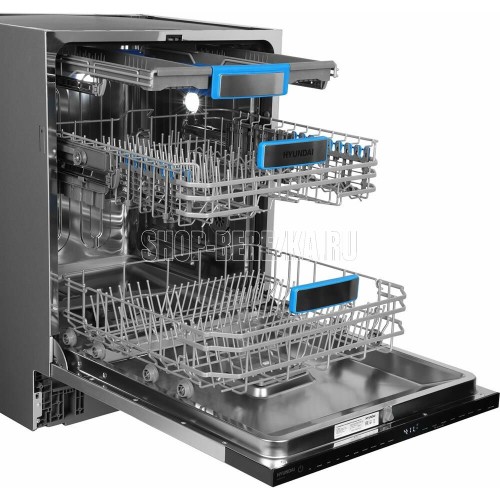 Посудомоечная машина полноразмерная. Управление сенсорное. Установка полностью. Сушка Hot Air Drying Класс мойки A Класс сушки A Время мойки при обычной программе 90 мин Загрузка, комплектов посуды 16 Количество корзин 3 Инверторный мотор Индикация звуковой сигнал, луч на полу, наличия ополаскивателя, наличия соли, этапов программы Защита от протечек, таймер отсрочки запуска Внутренняя конструкция корзина для столовых приборов, освещение, регулируемая по высоте корзина для посуды Технические характеристики Максимальный расход воды 14.7 л Минимальный расход воды 6.6 л Тип защиты от протечек полная (корпус + шланг для заливки воды) Технология защиты от протечек AquaStop Максимальное время отсрочки запуска 24 ч Минимальное время отсрочки запуска 1 ч Механизм сушки Hot Air Drying Максимальный уровень шума 42 дБ Программы Программы: Интеллектуальный режим, Мойка паром, Быстрая, Повседневная, Интенсивная, Гигиеническая, Стекло, Детская посуда, Замачивание, ECO Режимы.