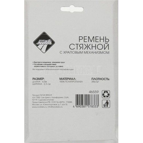 емень стяжной с храповым механизмом быстро и надежно закрепит груз. Устойчив к воздействию агрессивных погодных условий. Материал: 100% полипропилен Длина: 4.5 м. Ширина: 2.5 см. Плотность: 390 г/м2 Допустимая нагрузка: 350кг